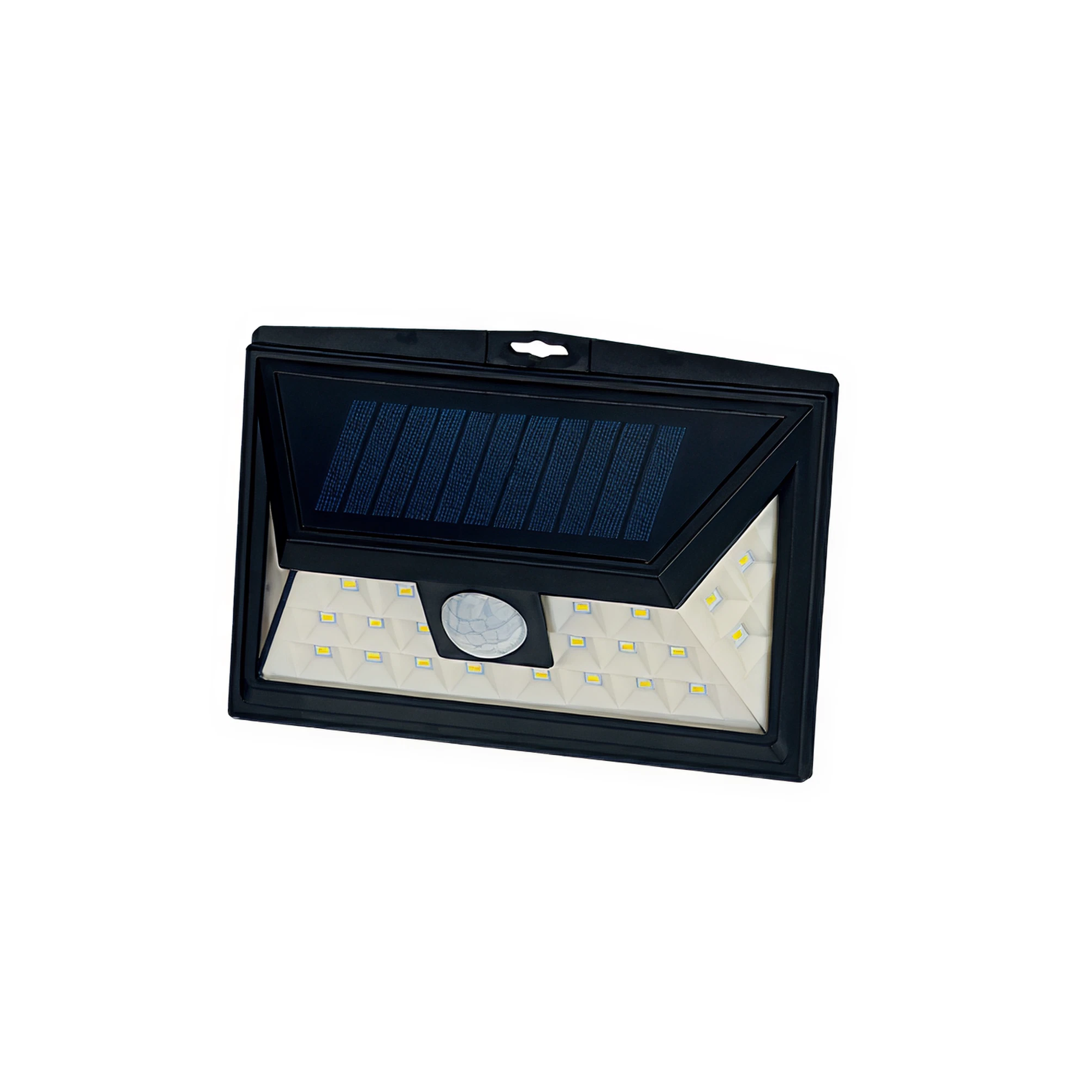Luminaria solar tipo aplique. Cuenta con panel solar y un sensor de movimiento, permitiendo el máximo ahorro de energía. Al detectar movimiento la intensidad de la luz alcanza su máximo de iluminación por unos segundos para volver a la normalidad.