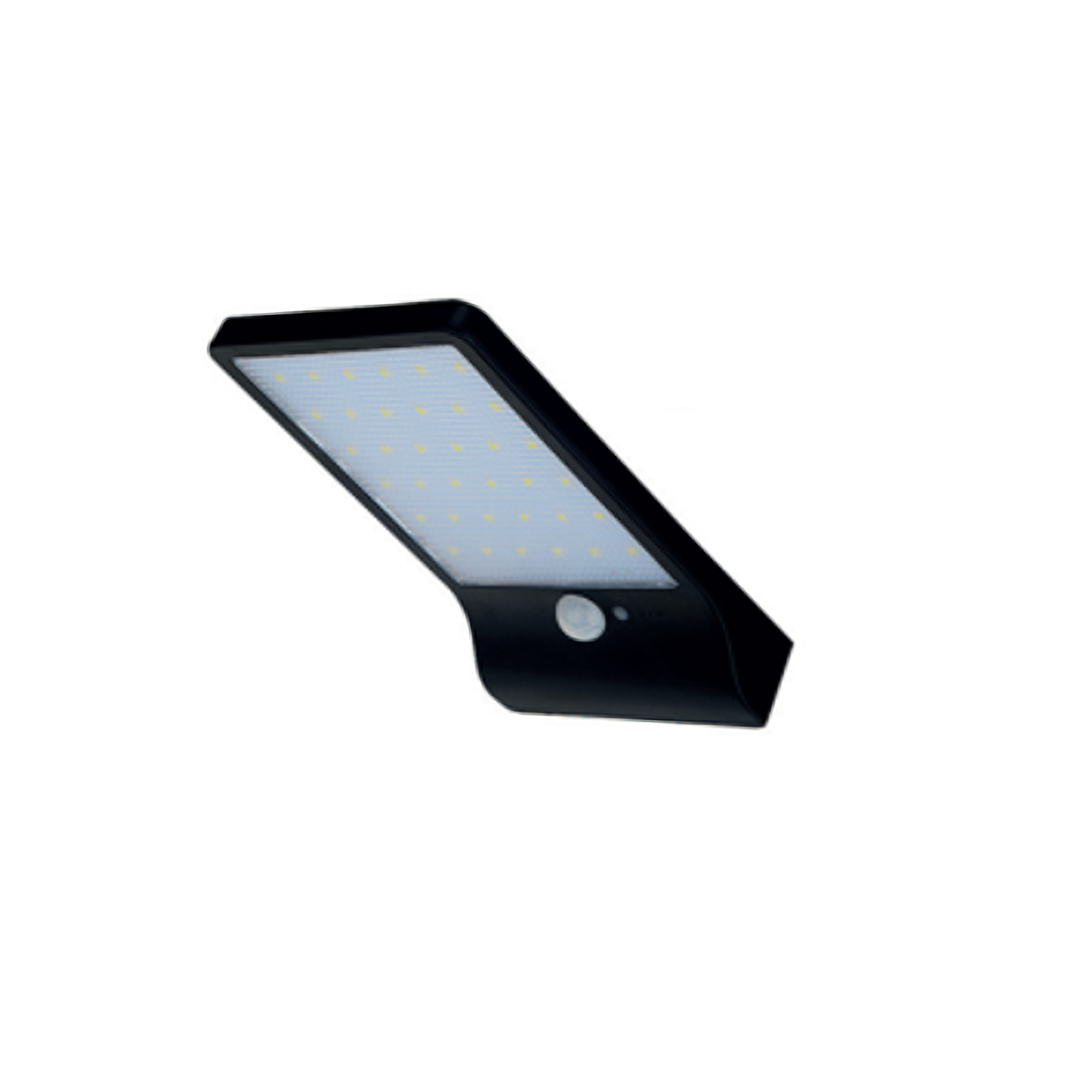 Luminaria solar tipo aplique. Cuenta con panel solar y un sensor de movimiento, permitiendo el máximo ahorro de energía.
